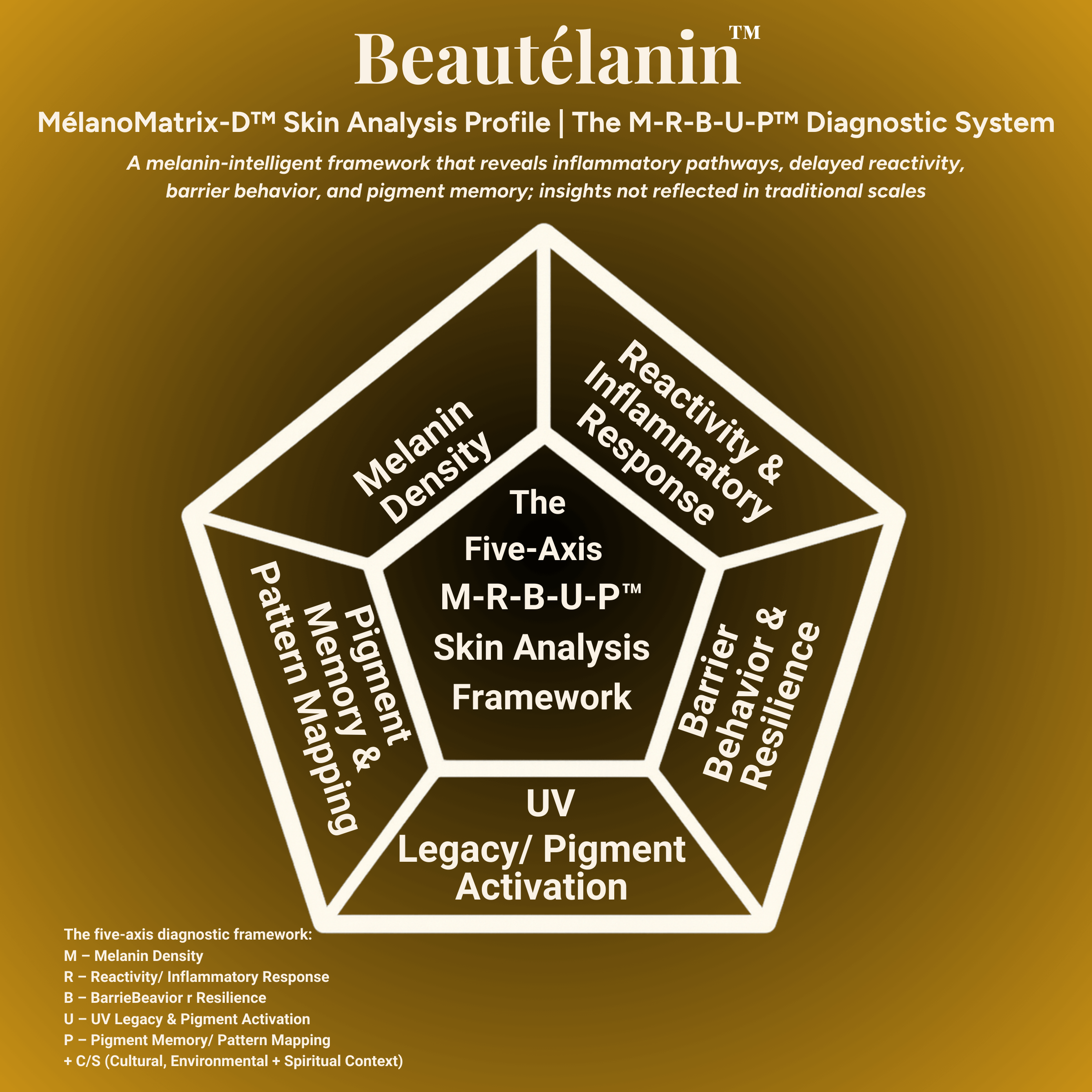 The MelanoMatrix-D™ is not just about color, it's about biology, behavior, and ancestral context. It evaluates skin using five interlocking dimensions (M-R-B-U-P™):